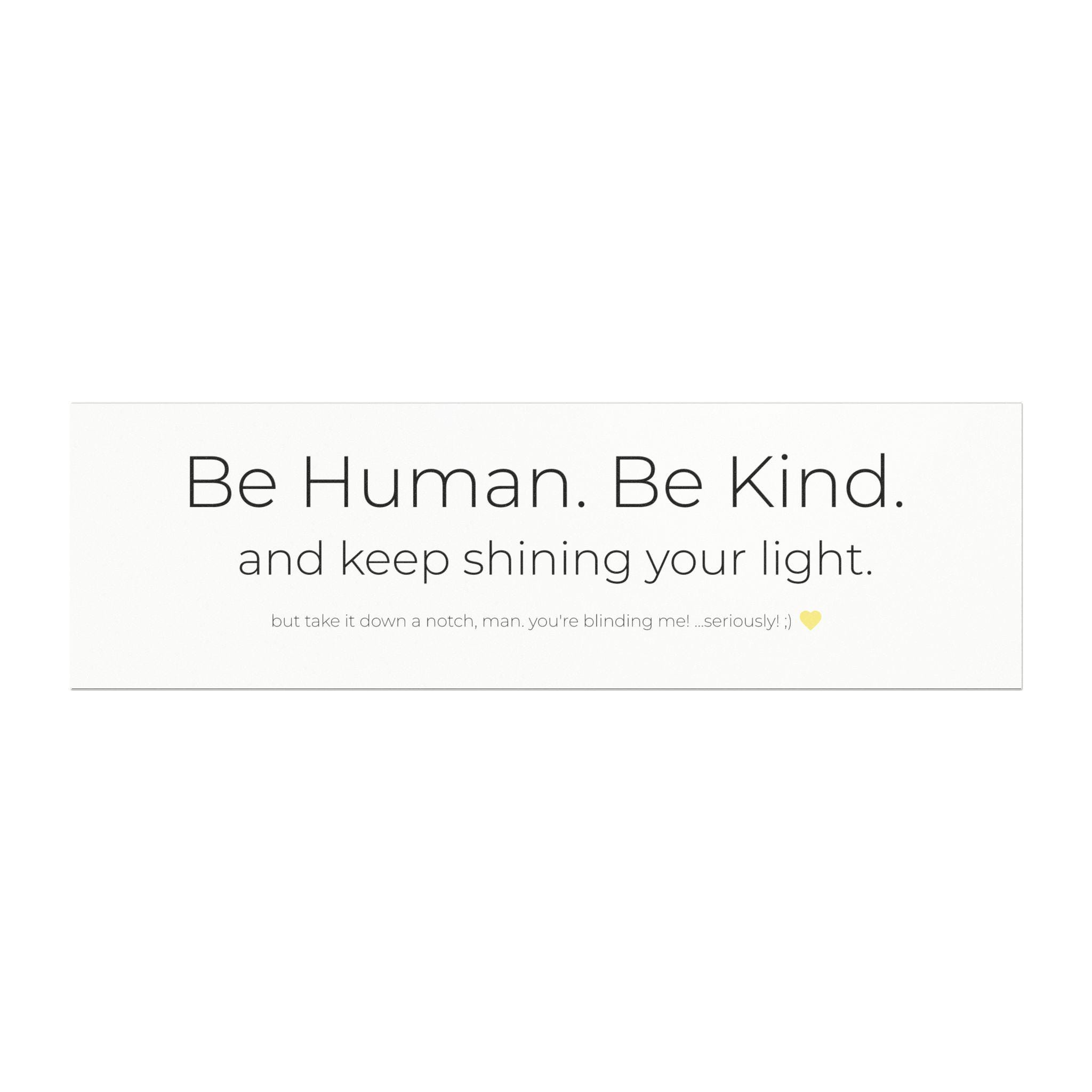 A heartfelt car magnet that brings joy and happiness from the back of your car. Clean typography on a white matte base reads an encouraging reminder to ‘Be Human. Be Kind. and keep shining your light.' and includes a quirky follow-up line, a heartfelt, silly nudge for connection that is sure to make fellow drivers and pedestrians smile. The matte finish and simple color palette keep the look minimal and approachable, while the magnetic backing sticks securely to vehicles without adhesive. It’s a small, everyday gesture that turns your car into a vehicle that brings joy and laughter to people everywhere.