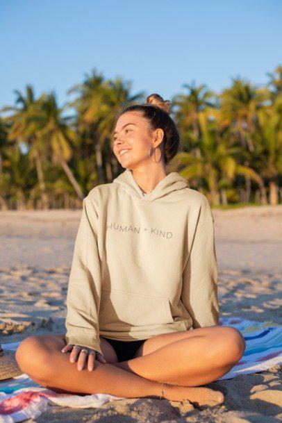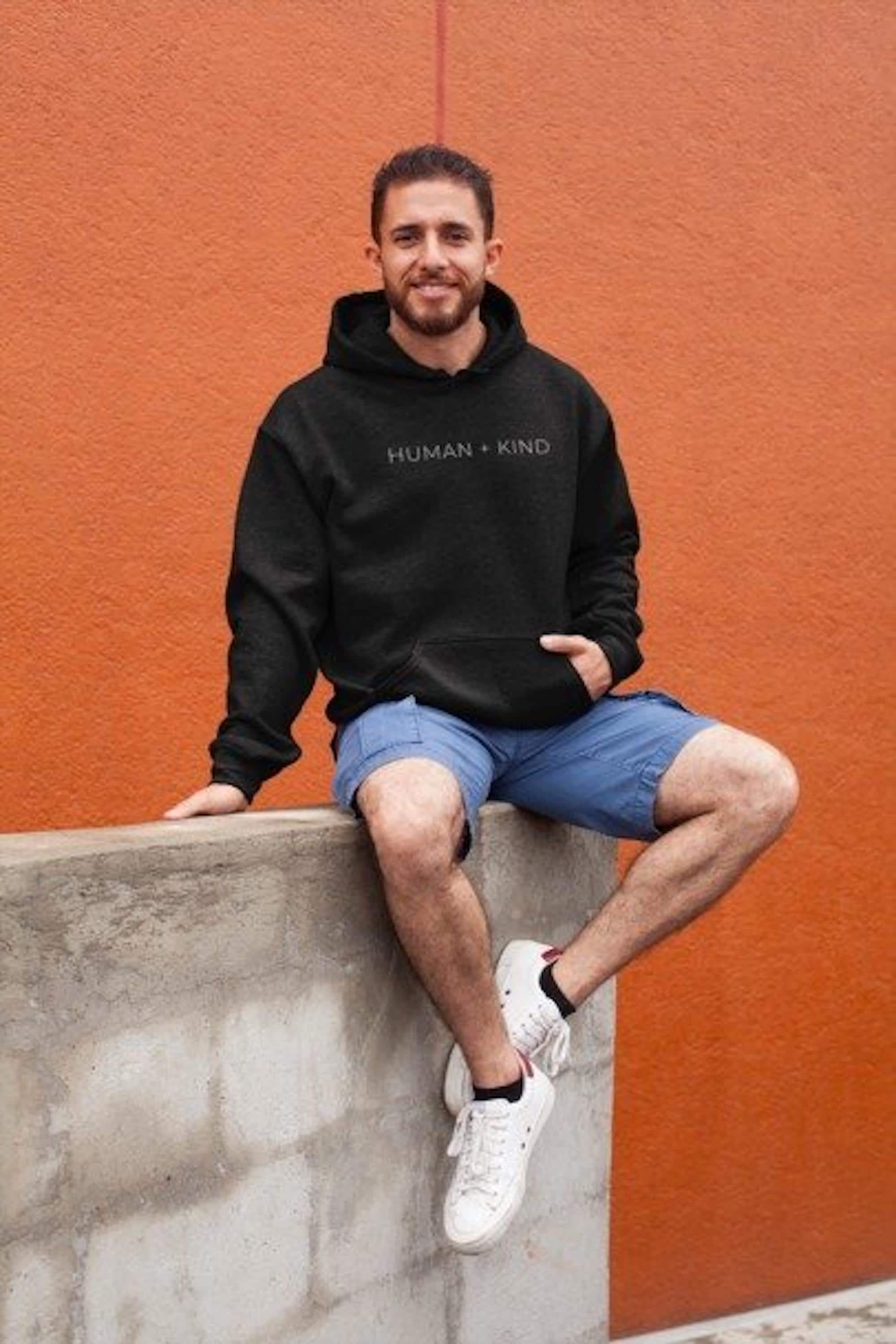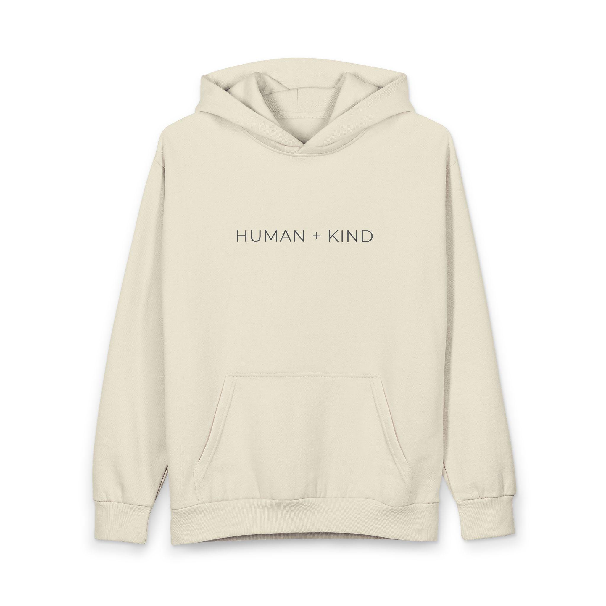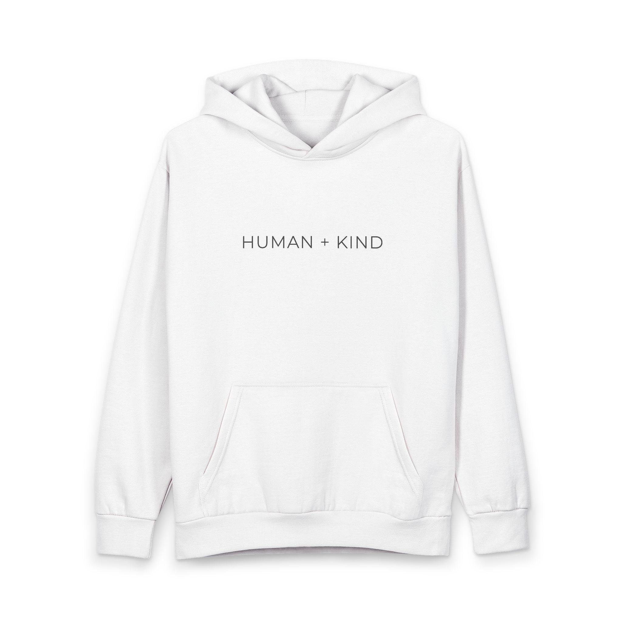 This HUMAN+KIND motivational hoodie is a minimalist unisex graphic sweatshirt designed for those who believe kindness is strength.