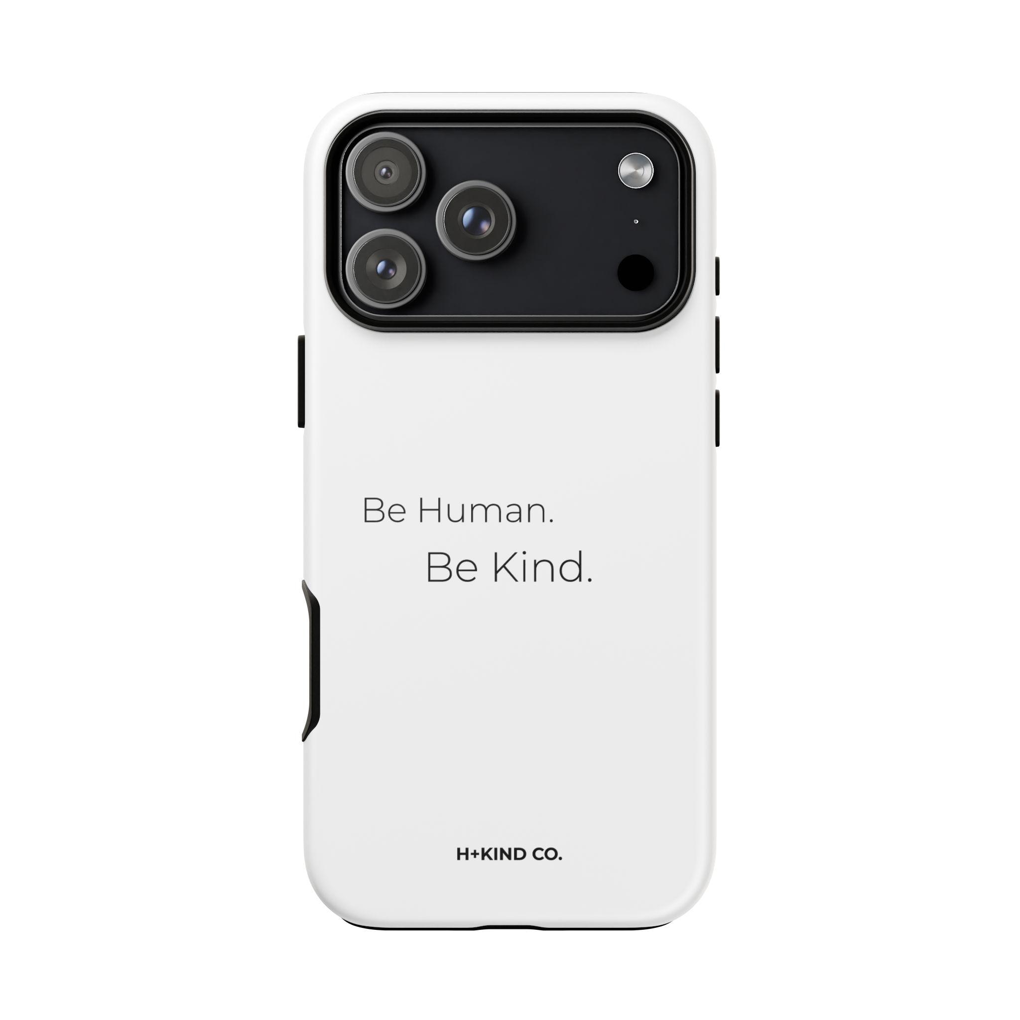 A sleek, dual-layer protective phone case that wears its message lightly: Be Human. Be Kind. Subtle black text sits on a clean white canvas, creating a minimalist accessory that blends into everyday life while quietly spreading a reminder. The rigid polycarbonate shell and soft TPU silicone liner work together to absorb shocks and resist impacts, while a glossy or matte finish keeps the aesthetic refined. UV-protected inks preserve the print when used outdoors, and precise cutouts keep ports accessible while supporting wireless charging. This case brings dependable protection with a calm, modern look- for people who prefer understated design and thoughtful intent in the things they carry.