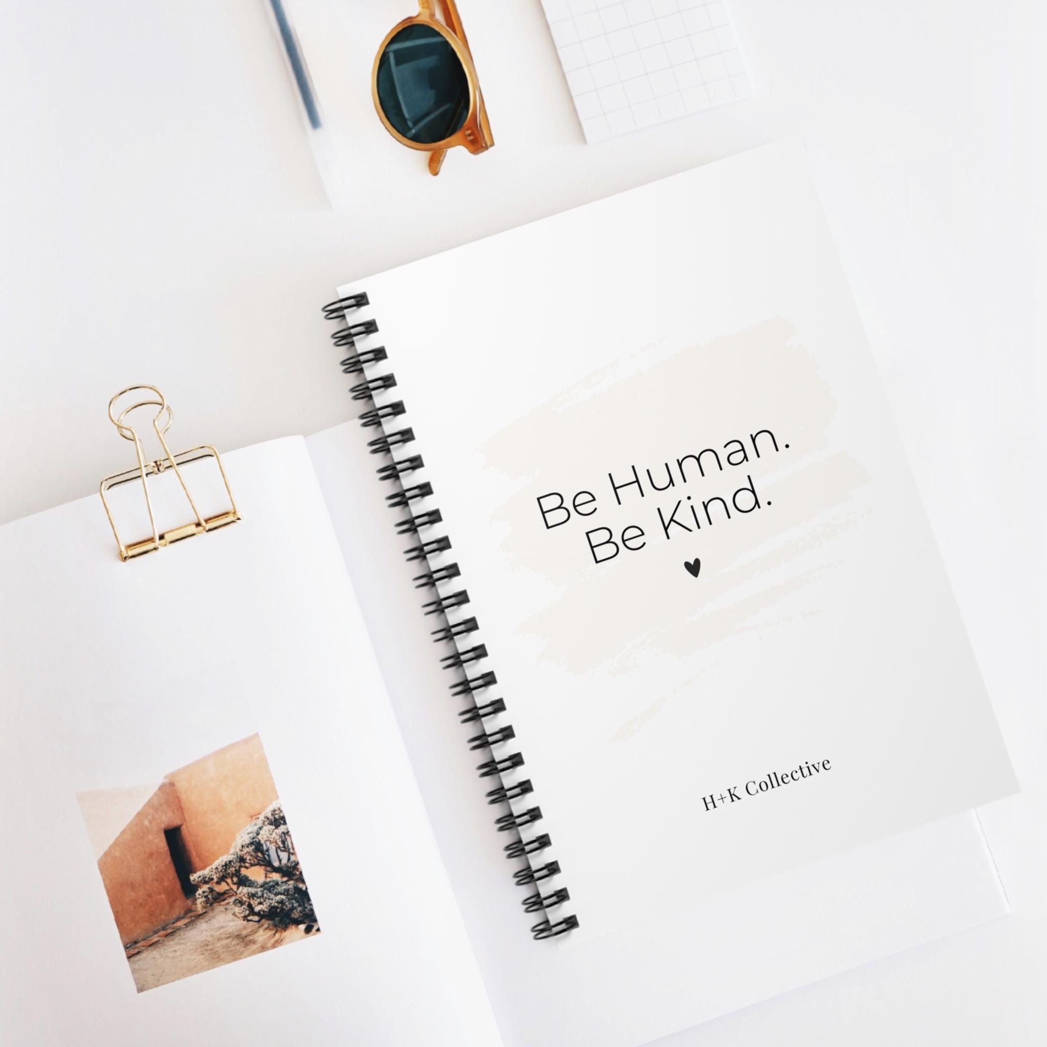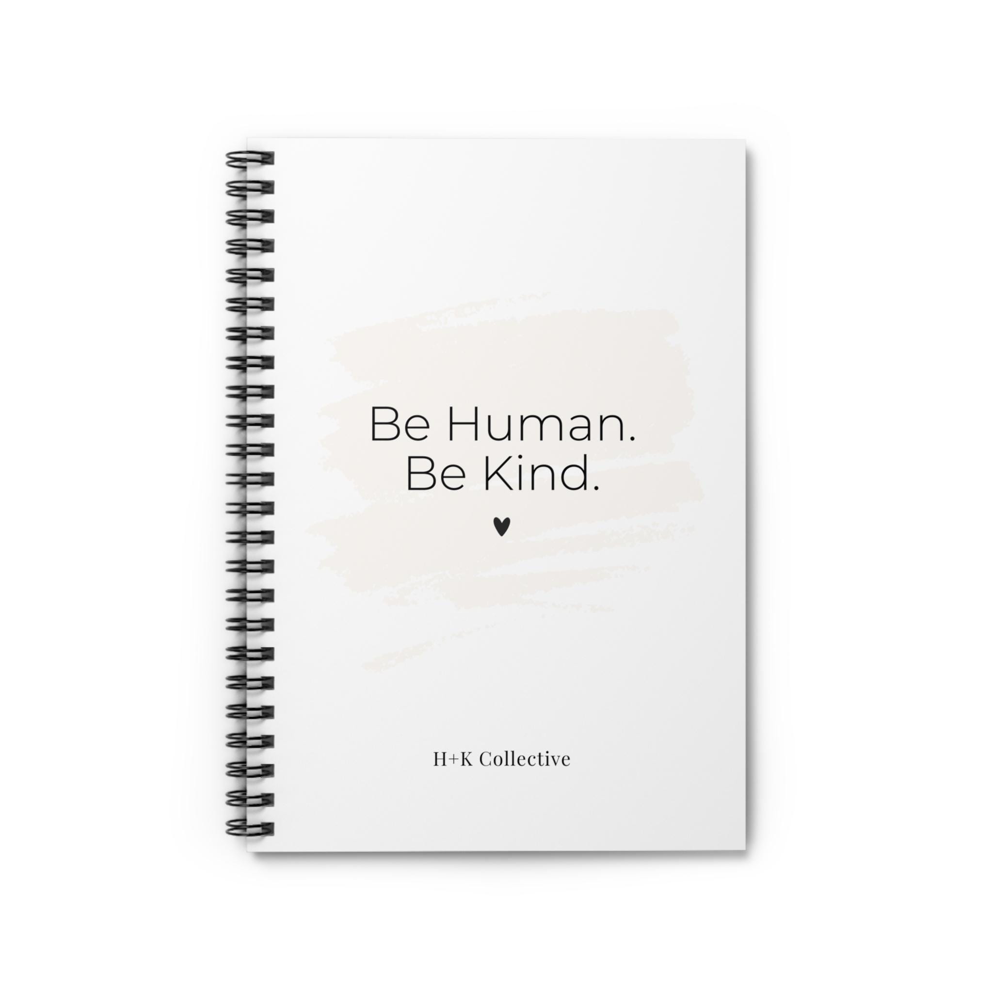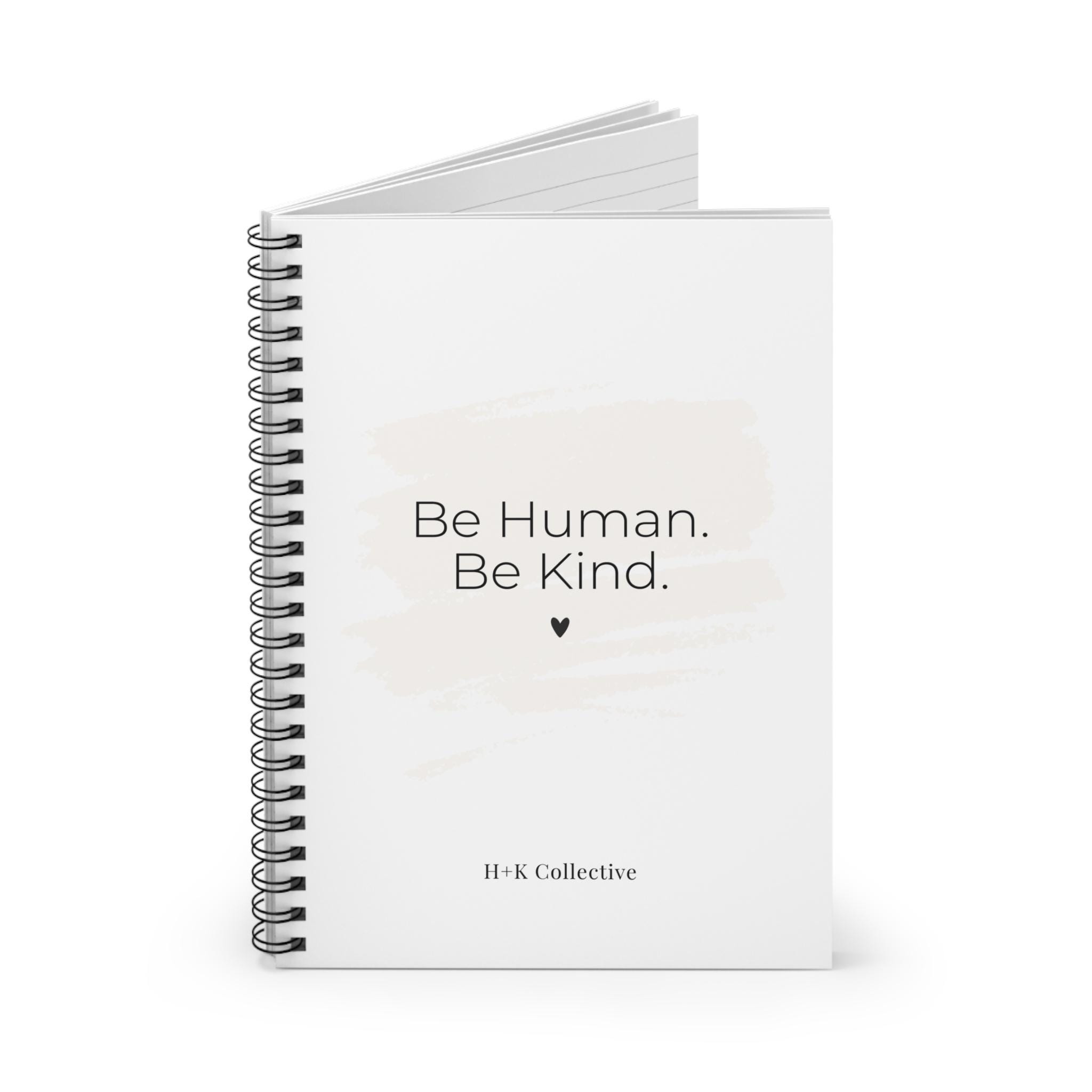 A compact, ruled spiral notebook designed to keep ideas flowing and daily plans within reach. The soft neutral cover features a gentle brushstroke and our classic reminder to “Be Human. Be Kind.” Crisp 90 gsm lined pages provide a smooth writing surface for notes, lists, and sketches. A sturdy metal spiral lets pages turn and remove easily, while an inside back document pocket holds receipts, notes, or loose papers. The durable 350 gsm covers and dark grey back give it a refined, minimal look that sits comfortably on a desk, in a tote, or beside your morning coffee.