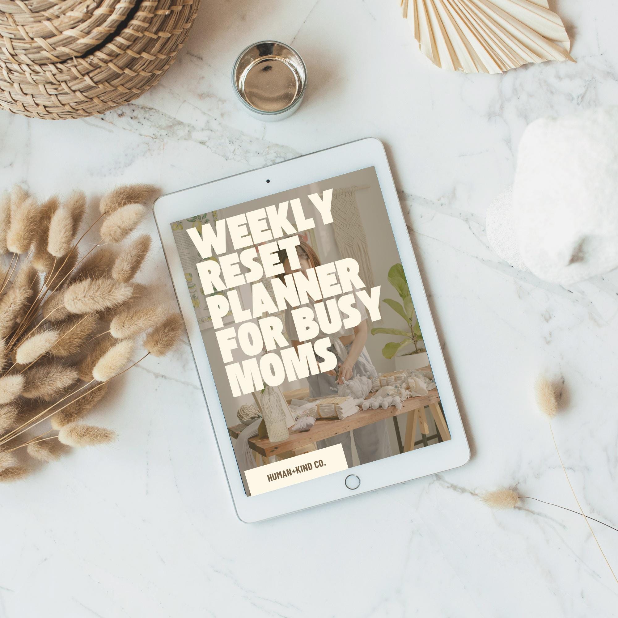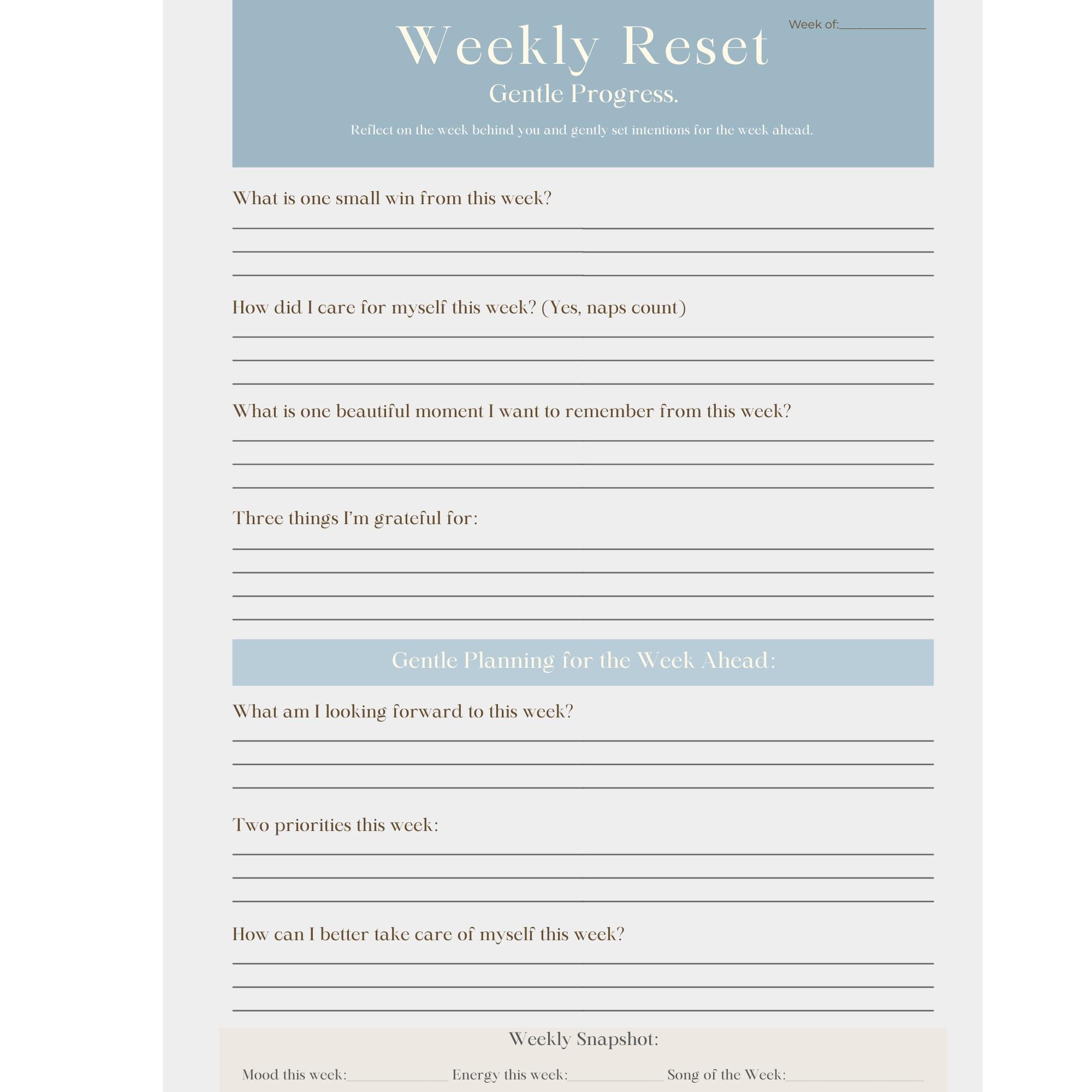 This printable and digital weekly reset planner was designed for busy moms who want a simple way to slow down, notice the good moments from their week, and set calm intentions for the week ahead.