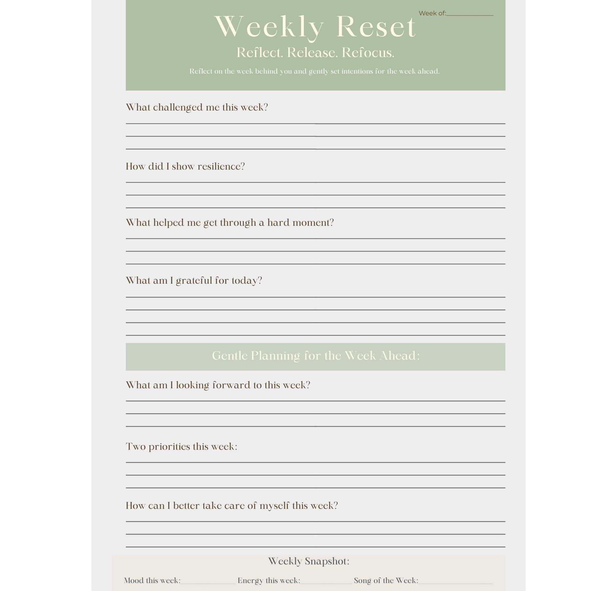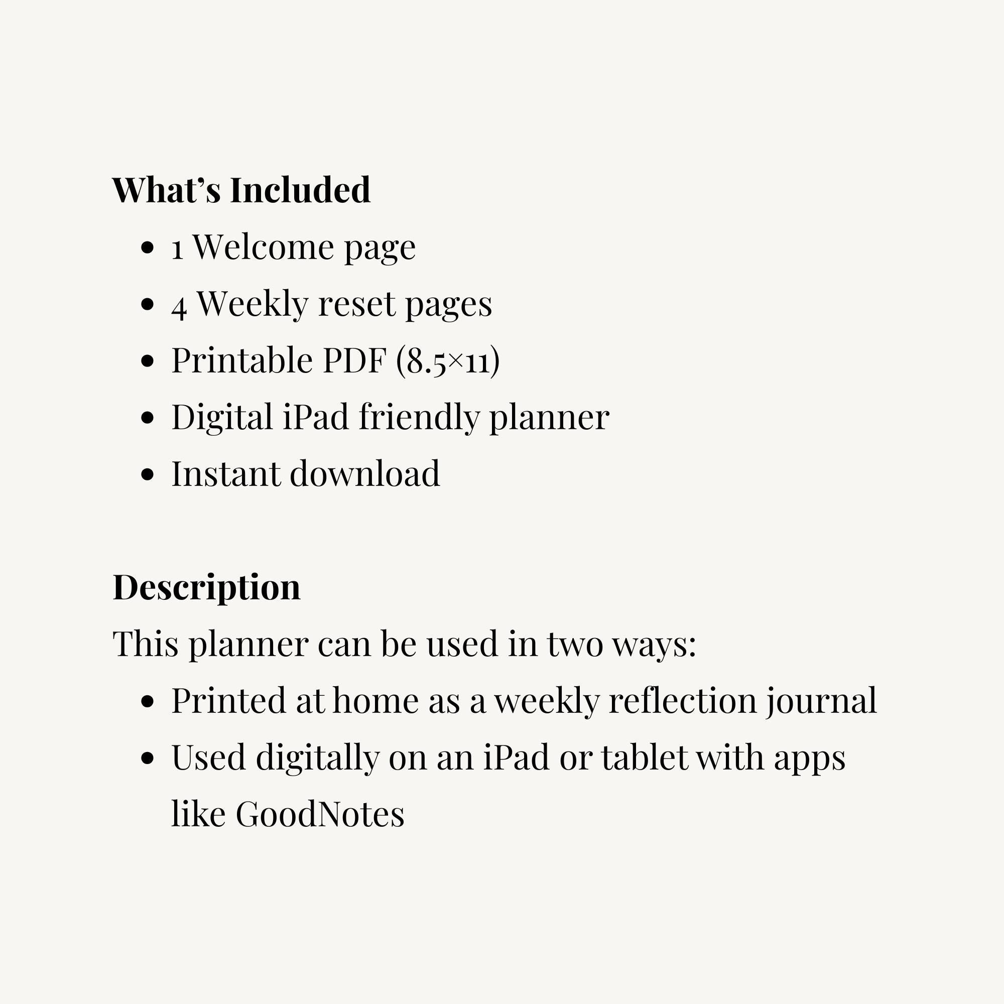 What's Included • 1 Welcome page • 4 Weekly Reset reflection pages • Printable PDF (8.5 × 11) • Digital planner pages for iPad/tablet use • Instant download